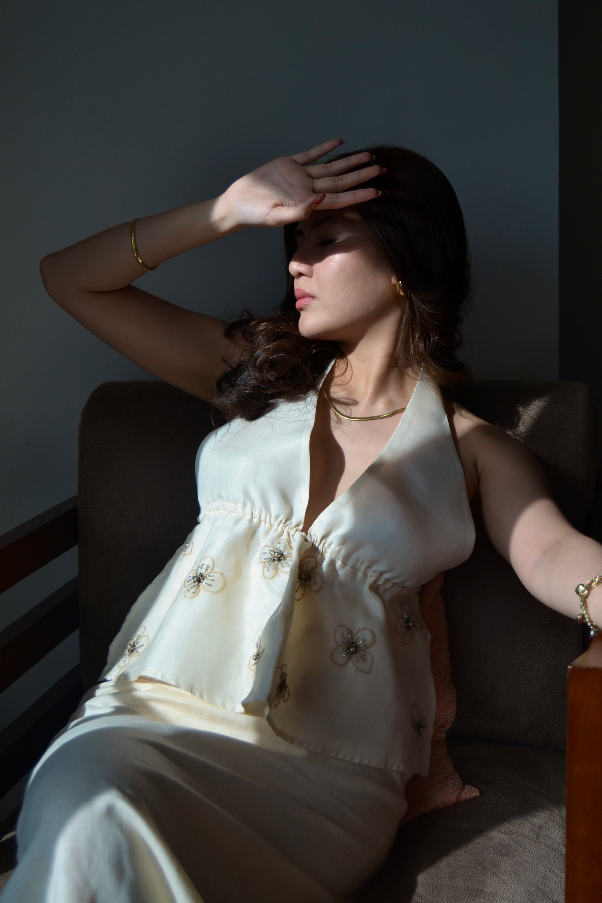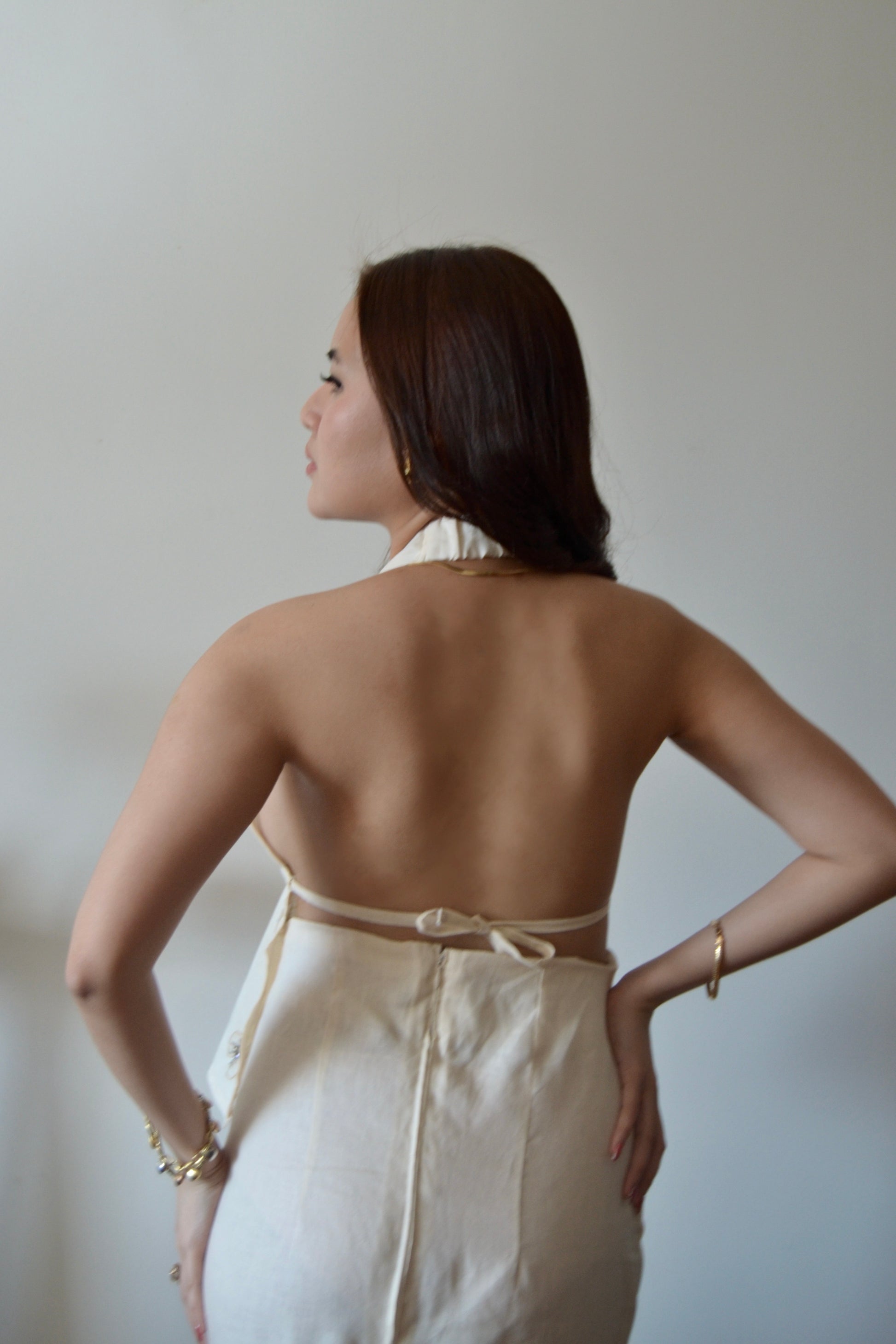 Mandira. She is the epitome of elegance and allure in the form of a haltered backless top, made from the delicate jusi fabric. What truly sets her apart is her intricate detailing. The flowering beadwork, carefully handcrafted, adds a subtle yet striking embellishment that exudes charm and femininity.