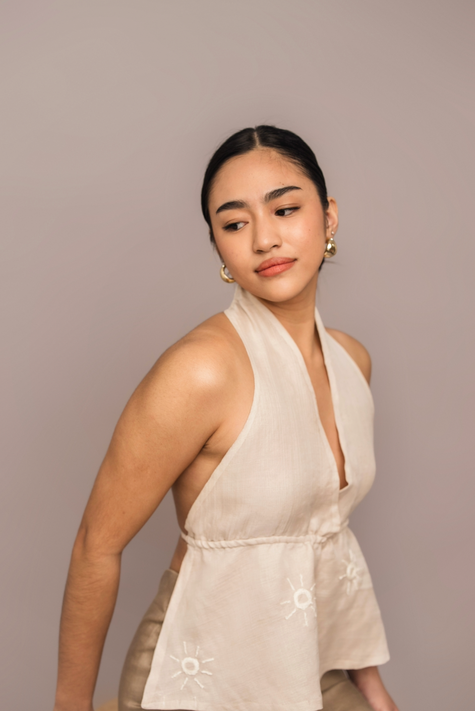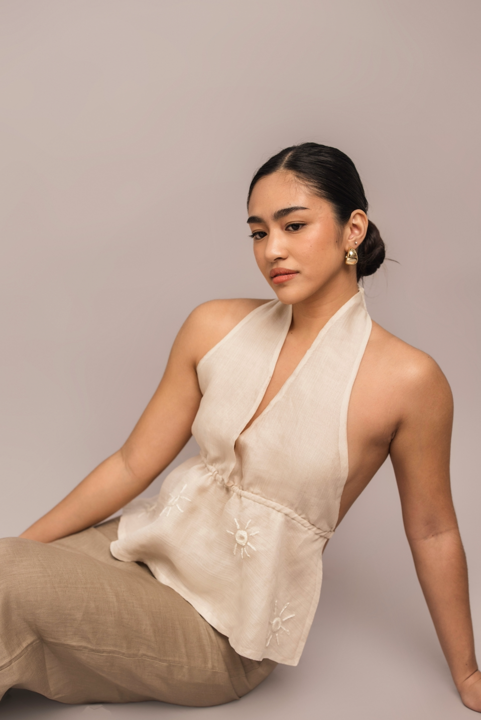Mandira. Her design exudes allure, featuring a flattering halter neckline that accentuates the shoulders. What sets Mandira apart is her material—cocoon-piña, and her sun embroidery. She adapts seamlessly to various styles, promising versatility and timeless appeal.